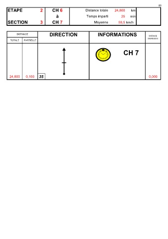 80 ETAPE 2 CH 6 Distance totale 24,800 km à Temps imparti 25 min SECTION 3 CH 7 Moyenne 59,5 km/h L CENTRE LEEE L DISTANCE DIRECTION INFORMATIONS DISTANCE DEGRESSIVE TOTALE PARTIELLE CH 7 24,800 0,100 35 0,000